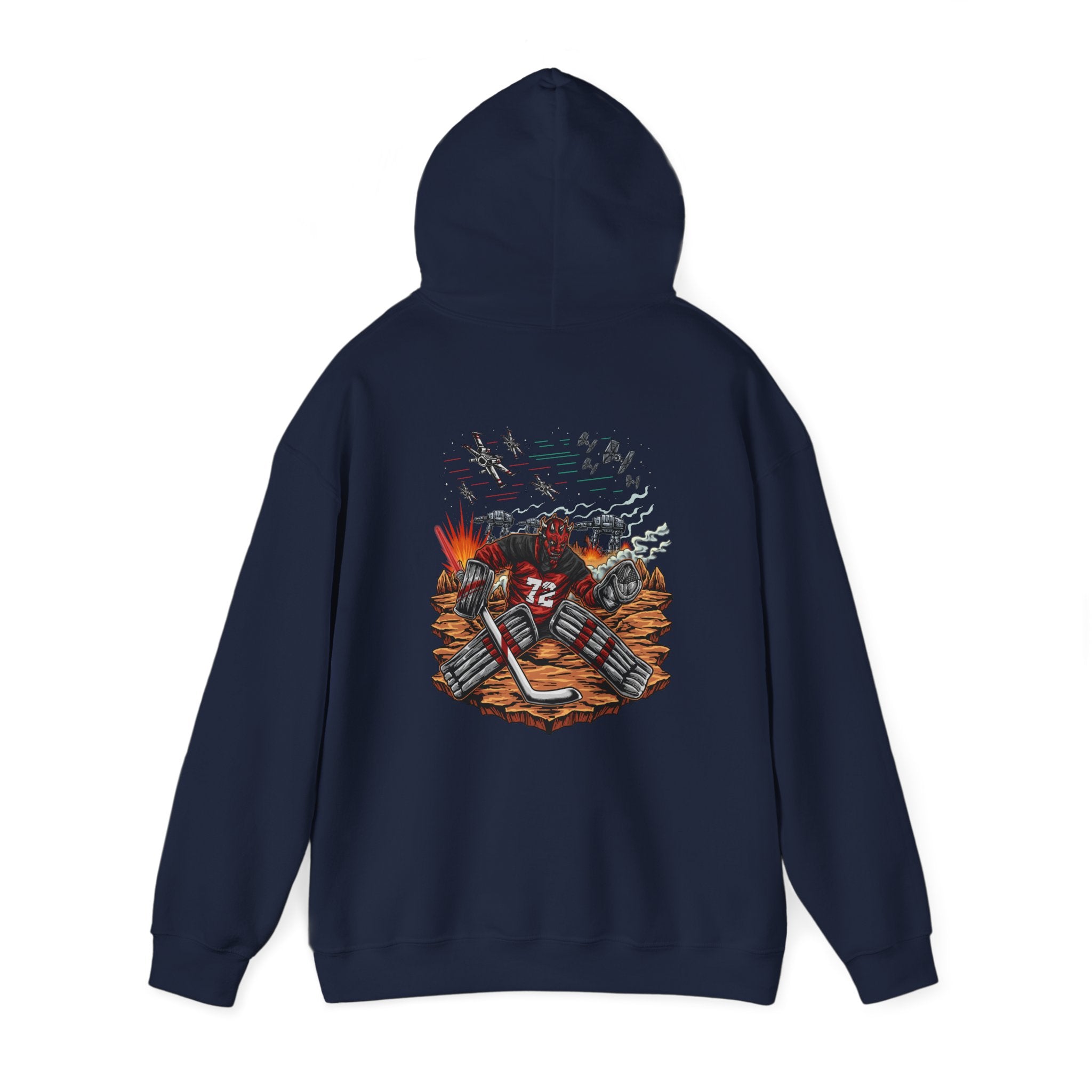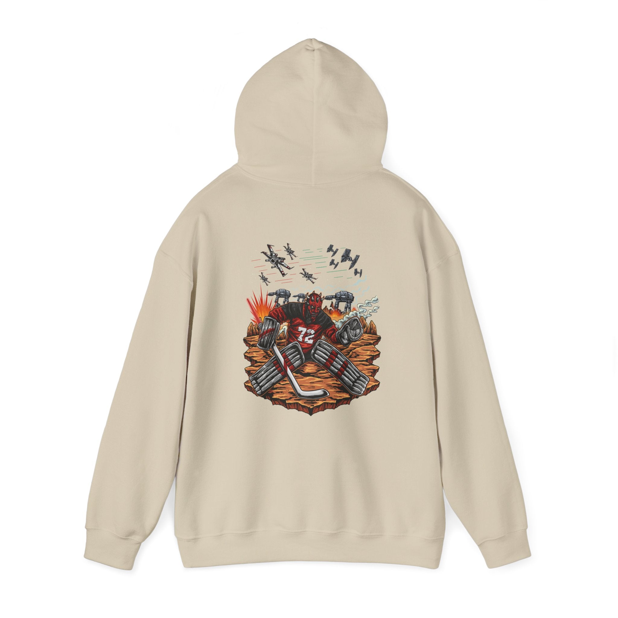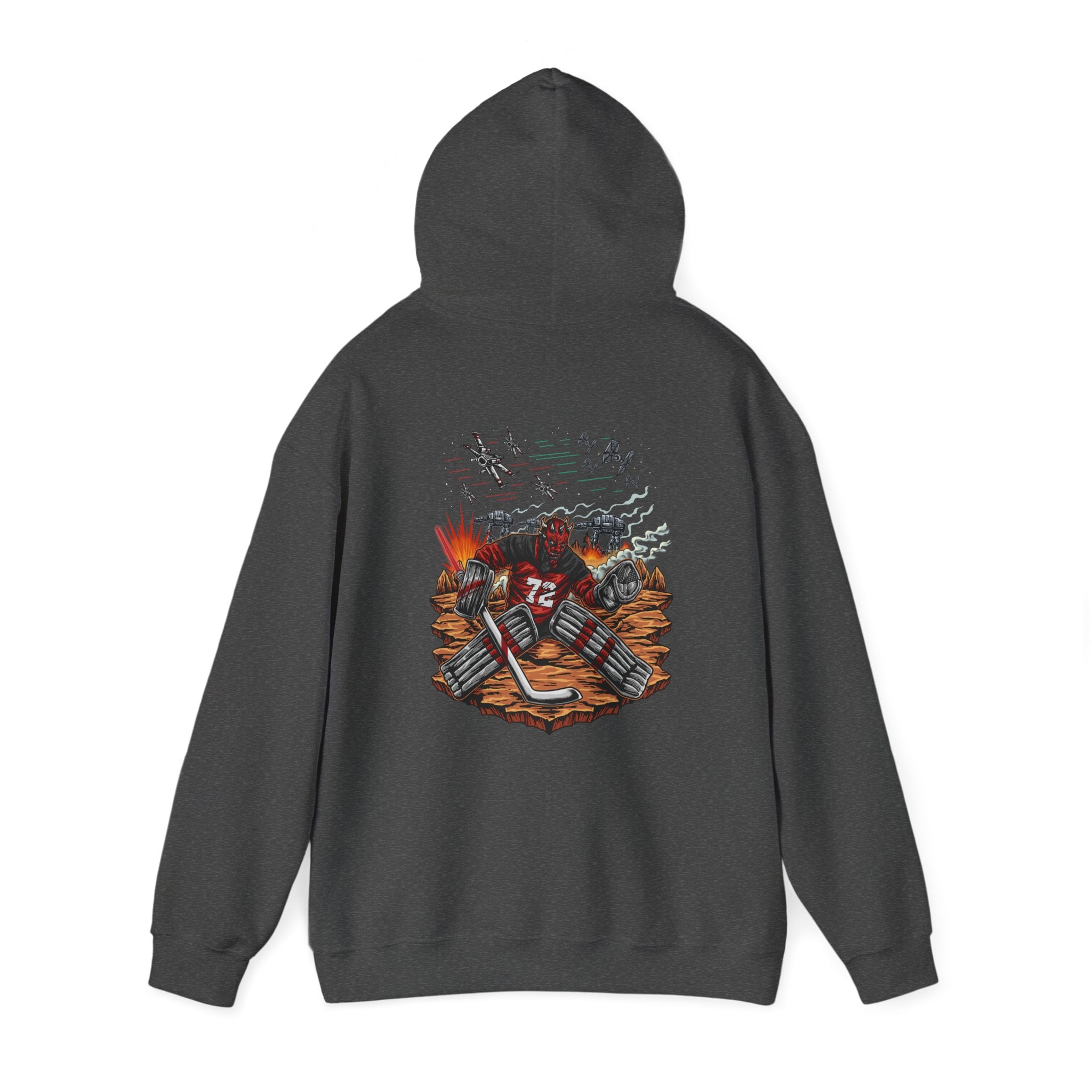 A hockey hoodie designed for Darth Maul goalies, perfect for staying warm and stylish on and off the ice. This hoodie is ideal for hockey fans looking for a unique and comfortable piece to express their love for the sport.