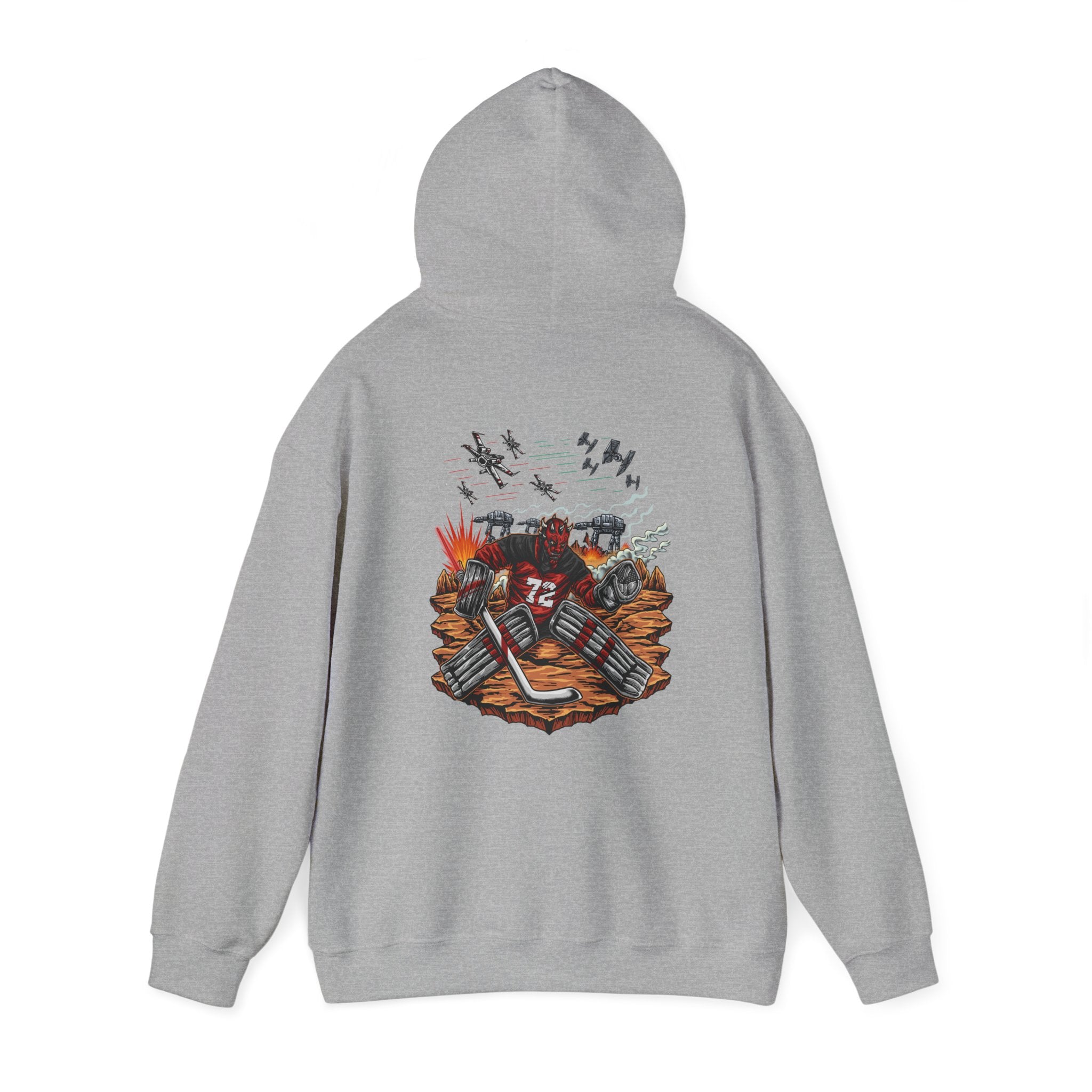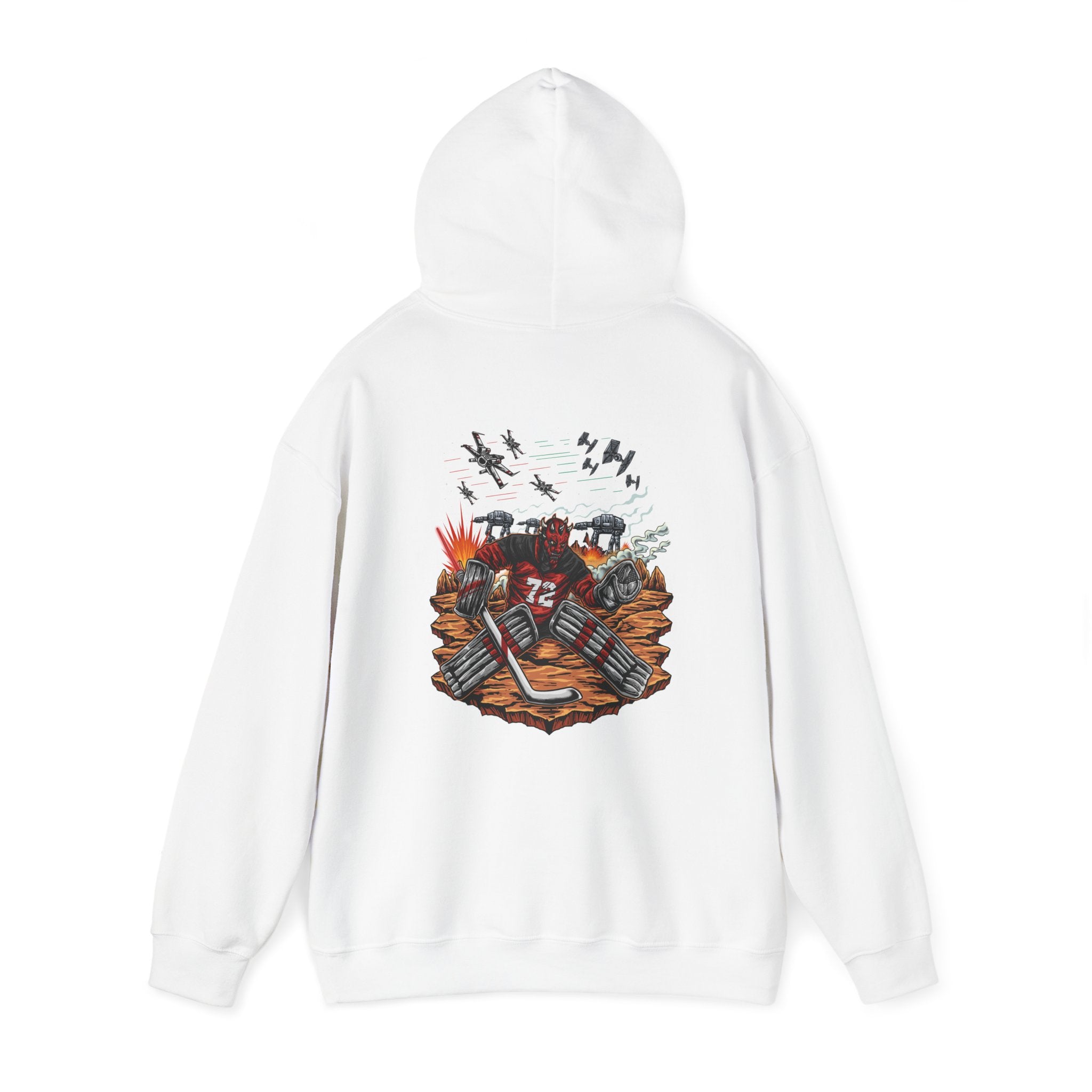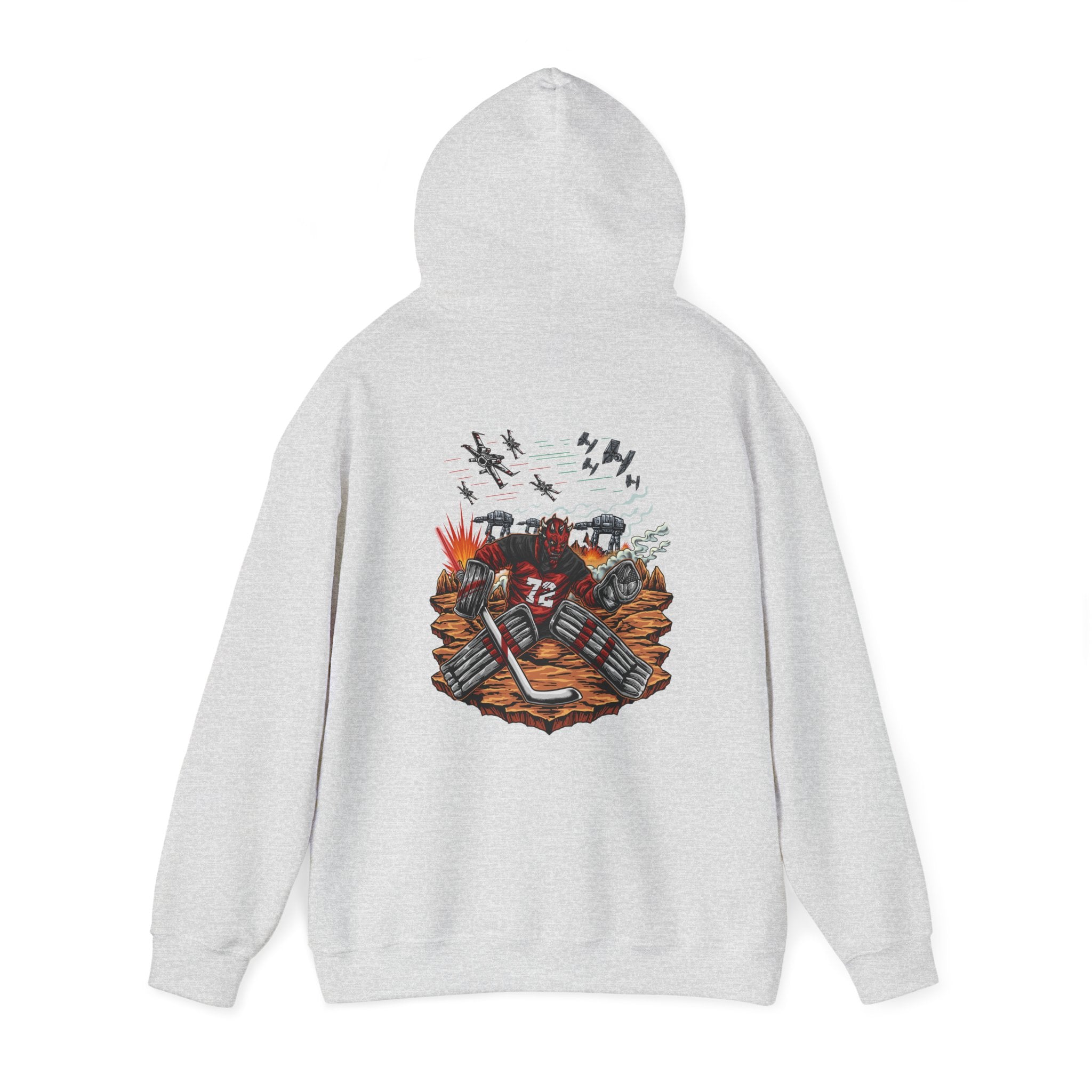 A hockey hoodie designed for Darth Maul goalies, perfect for staying warm and stylish on and off the ice. This hoodie is ideal for hockey fans looking for a unique and comfortable piece to express their love for the sport.